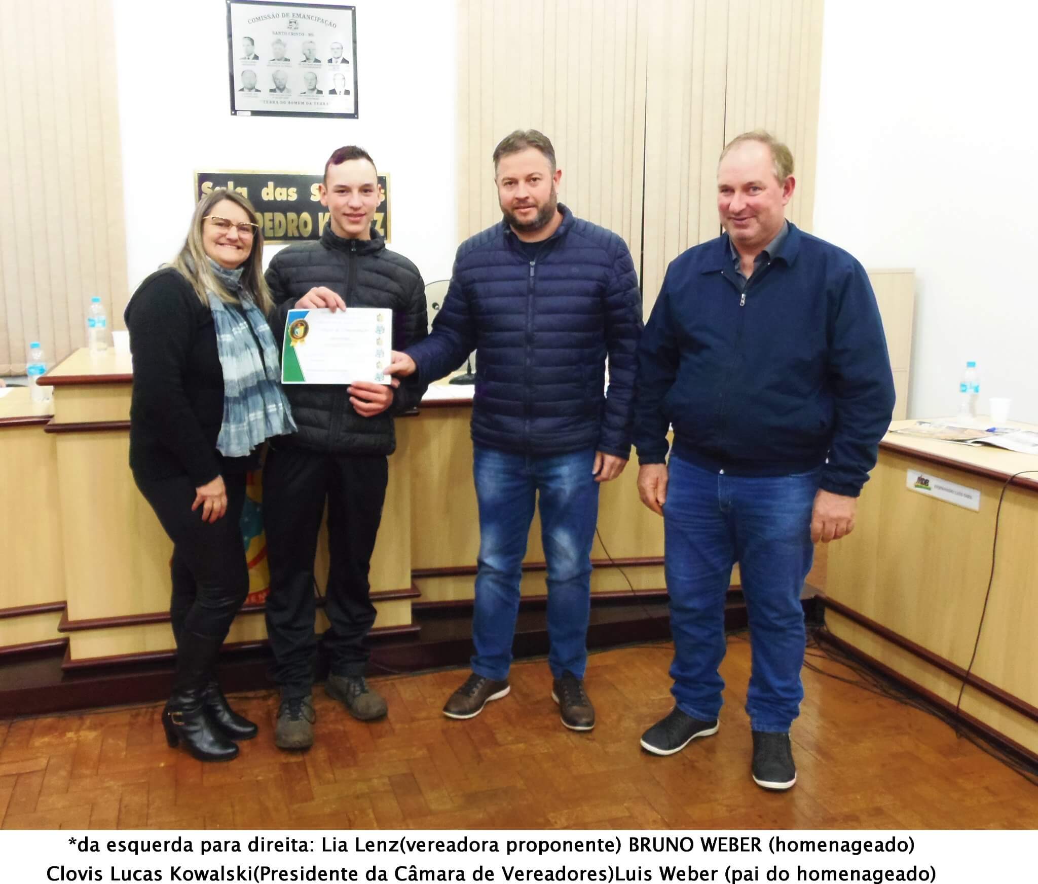 A Câmara de Vereadores realizou durante a 14ª Sessão Ordinária (13.06.2022) a entrega da Moção de Congratulações ao Educando Bruno Weber, da Escola Municipal de Ensino Fundamental Paulo Freire, pela conquista da Medalha de Prata na 16ª Olimpíada Brasileira da Matemática das Escolas Públicas - OBMEP, relativa ao ano de 2021. O ato de premiação da medalha ocorreu na Universidade Federal de Santa Maria/RS, no dia 27 de maio do corrente ano.